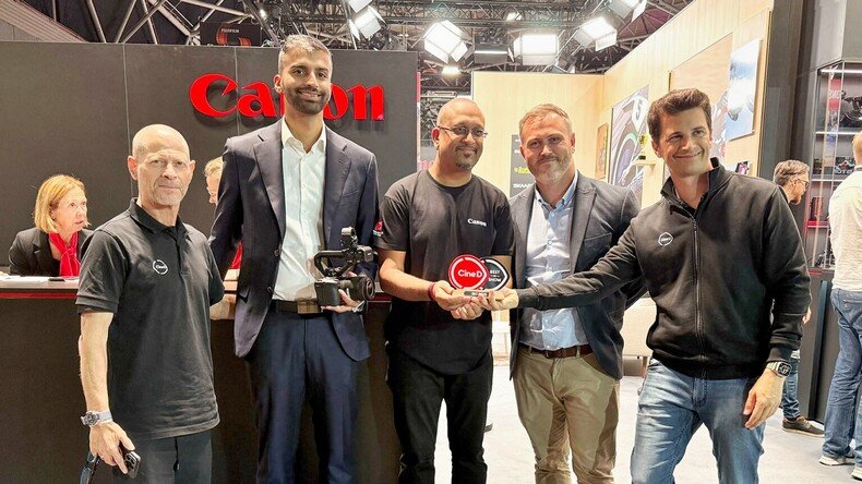 Οι καλοί φίλοι και αυστριακοί συνάδελφοι Τζόνι και Νίνο του Cine D απονέμουν το βραβείο τους "Cine D Best of Show" στην ομάδα της Canon για την επιτυχημένη τους C50.