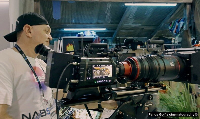 Tη φωτογραφία μου αυτή από το Βέγκας, πέρυσι τον Απρίλιο του 2024, την έβγαλε ο συνεργά-της μου ο Θανάσης Γαλής, στο τεράστιο booth της Blackmagic, τη μέρα που ντεμπουτάρισε επι-σήμως, παγκοσμίως, η ναυαρχίδα της Blackmagic, η 17άρα (17K) Ursa Cine 65, η μεγαλύτερη κάμερα του κόσμου που μπορεί κάποιος να αγοράσει!