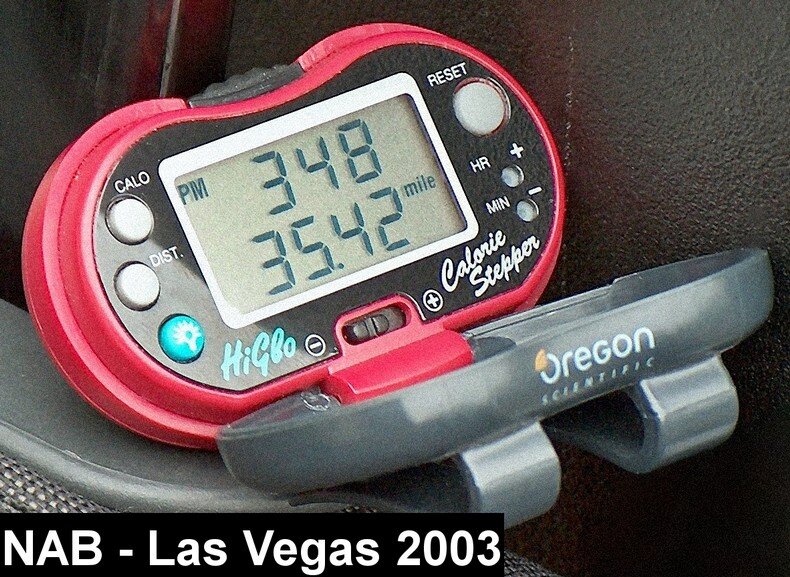 Η φωτογραφία που βλέπετε πιο πάνω, και που δεν θα σας την δείξει κανένας άλλος, είναι φωτο-γραφία του μετρητή βημάτων/αποστάσεων του Πάνου Γκόλφη, στο τέλος της 4ης μέρας του NAB του 2003, (τότε και τα δύο μεγάλα shows, τα μεγαλύτερα του κόσμου, κρατούσαν 5 μέρες και όχι 4 όπως τώρα, τα τελευταία 4-5 χρόνια), κάτι που σημαίνει ότι και με την τελευταία μέρα του σόου, την πέμπτη μέρα, τα μίλια στο σύνολό τους έφθαναν τα 45, δηλαδή συνολικά 72(!!!) χιλιόμετρα footwork/περπάτημα μέσα στις 5 μέρες του έκαστου σόου!