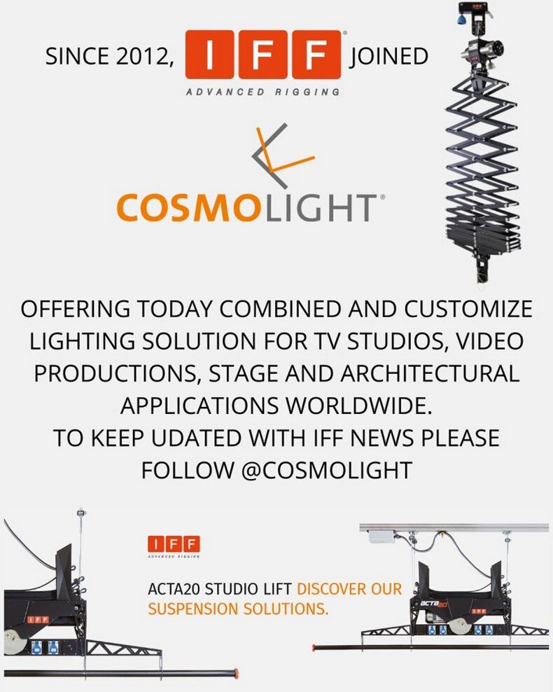 Στο περίπτερο 12.C42 του μεγάλου κινηματογραφικού χωλ Νο.12, η ιταλική εταιρεία Cosmolight είχε φέρει τα φώτα της και τα άλλα εργαλεία της όπως τα πολύ καλά hoists/σταγκόνια της.