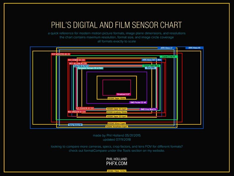 Σ'αυτό το τσαρτ του αμερικανού συναδέλφου Φιλ Χόλαντ βλέπετε τις διαφορές πολλών αναλο-γικών και ψηφιακών φορμά. Το μεγαλύτερο απ'αυτά, το κίτρινο πλαίσιο που υπάρχει στα όρια της φωτογραφίας είναι το 15άρι IMAX, δηλαδή το original, το γνήσιο IMAX, αυτό με τα 15 perfs (περφορέ), με τα τρία 65άρια frames, το οποίο κινείται οριζόντια, όπως και το παλιό VistaVision.