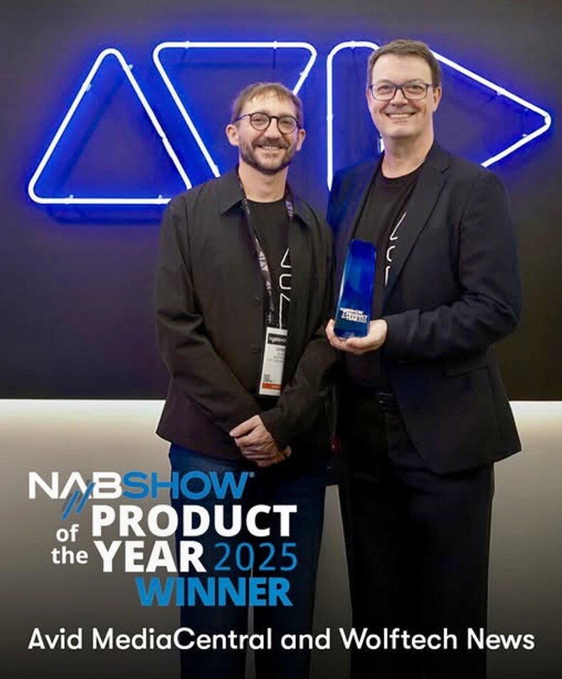 Πώς να μην είναι συνέχεια χαρούμενοι οι άνθρωποι της σπουδαίας Avid; Αφού συνεχώς κερδί-ζουν μεγάλα βραβεία σε όλο τον κόσμο! Εδώ βλέπετε το μεγάλο βραβείο PRODUCT OF THE YEAR που κέρδισαν τον περασμένο Απρίλιο στο Βέγκας, στο NAB, για το Media Central και το καινούργιο life saving εργαλείο Wolftech News.