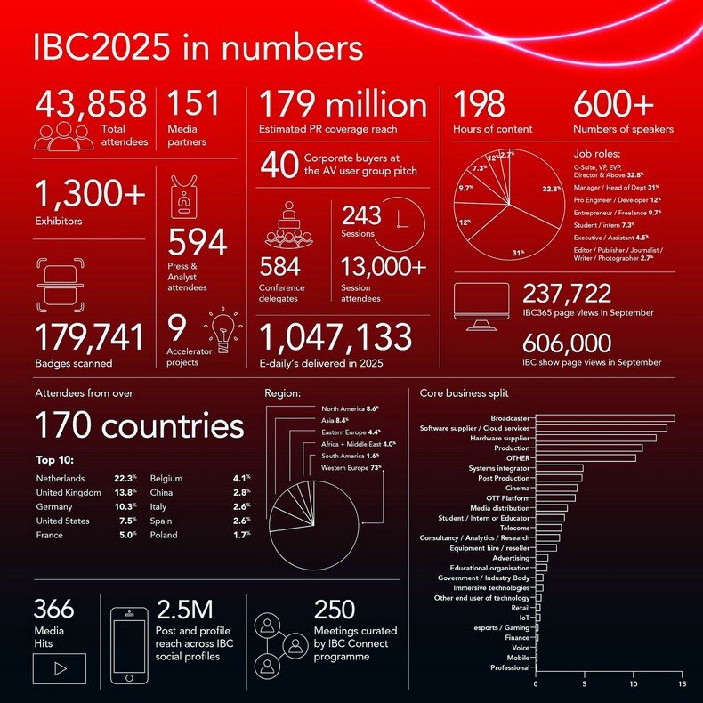 Οπως βλέπουμε και στο επίσημο chart του IBC 2025, οι επισκέπτες του φετινού σόου ήταν περίπου 44.000 από 170 χώρες του κόσμου. Αυτά είναι τα νούμερα που ισχύουν τα τελευταία 3 χρόνια, από το restart του IBC (λόγω κορωνοϊού) και μετά, μέχρι σήμερα. Στην pre-covid εποχή τα νούμερα επισκεψιμότητας ήταν μεγαλύτερα σε όλα τα trade shows και όχι μόνο στο IBC.