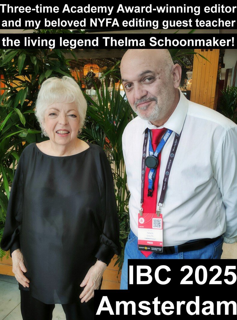 Εχω τη χαρά, την ευλογία και το προνόμιο να είμαι ο μοναδικός από τους 45.000 συνέδρους και επισκέπτες του IBC 2025 που πέρασα στο Αμστερνταμ λίγη ώρα μαζί με την σπουδαία Θέλμα Σκουνμέϊκερ, την θρυλική μοντέζ και μόνιμη συνεργάτιδα του Σκορσέζι! Η βραβευμένη με 3(!!!) βραβεία Οσκαρ και 100άδες άλλα σημαντικά βραβεία σε όλο τον κόσμο, ήταν κάποτε, πριν 33 χρόνια, δασκάλα μου, guest teacher (όπως ήταν και ο τεράστιος Σκορσέζι) στην σχολή μου στη Νέα Υόρκη.